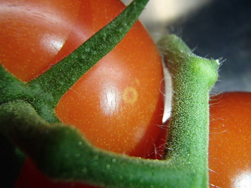 Botrytisstip kan ontstaan wanneer de vruchten aan de plant nat worden door condensvorming.als gevolg van temperatuurverschillen.